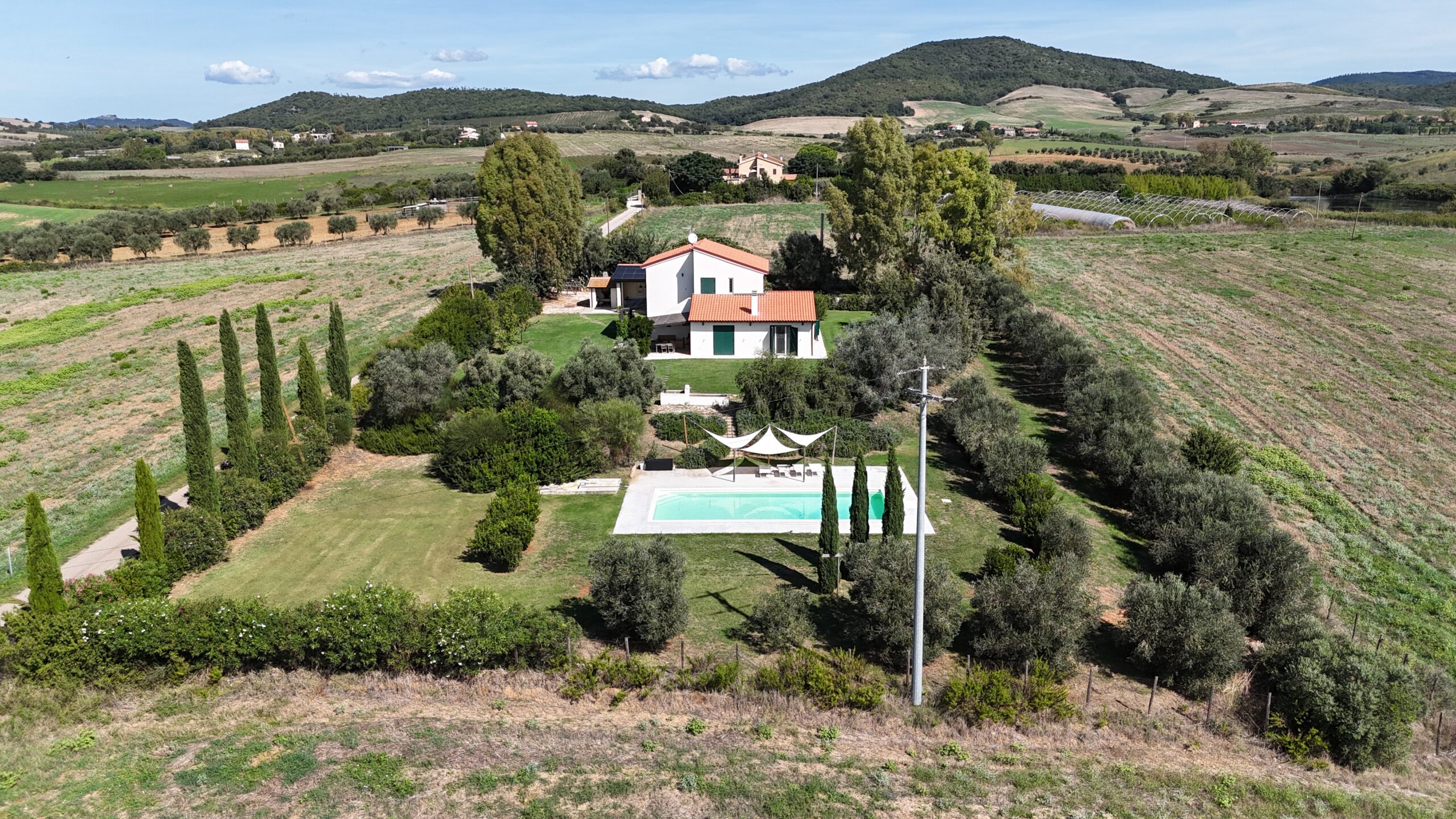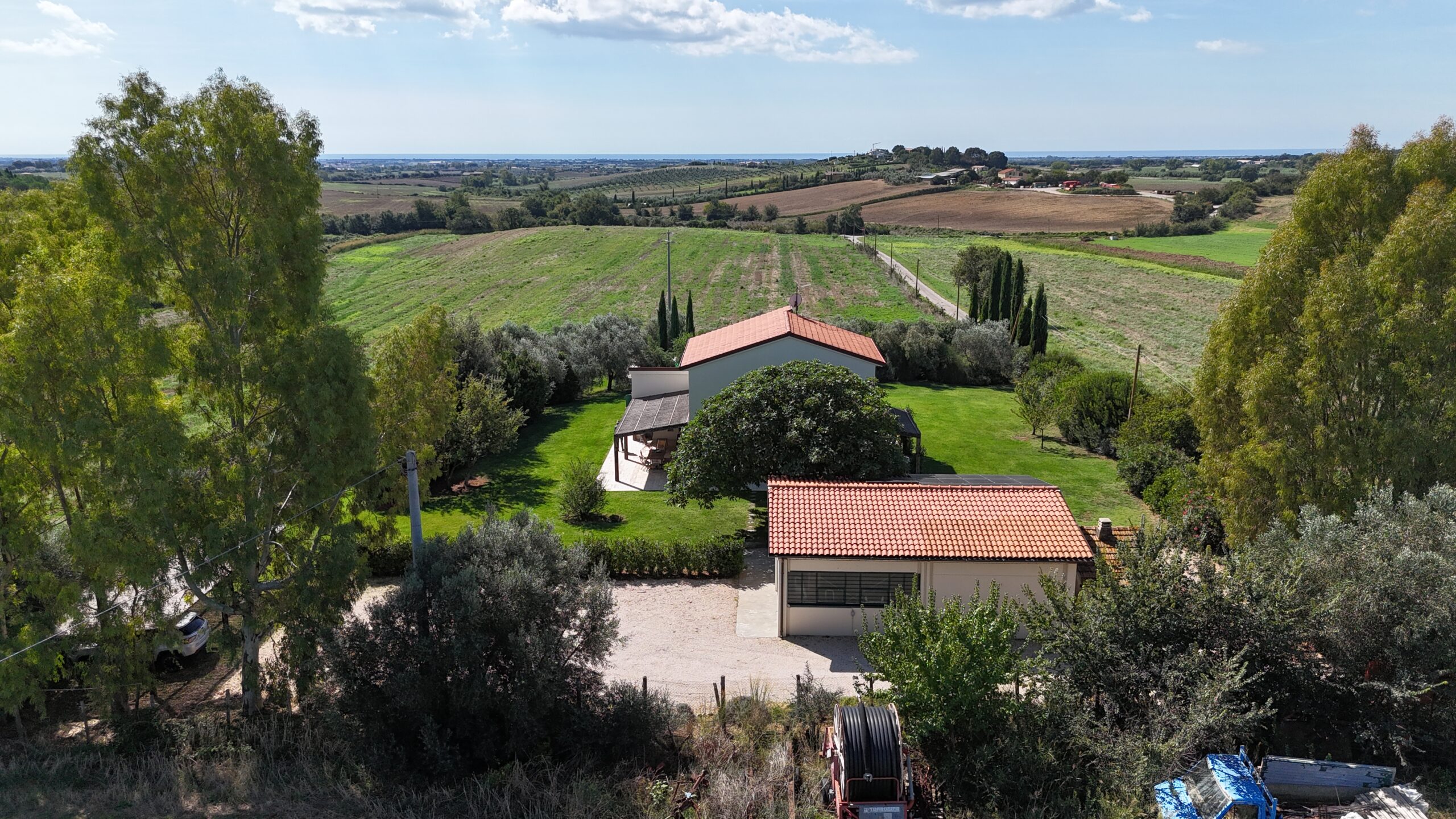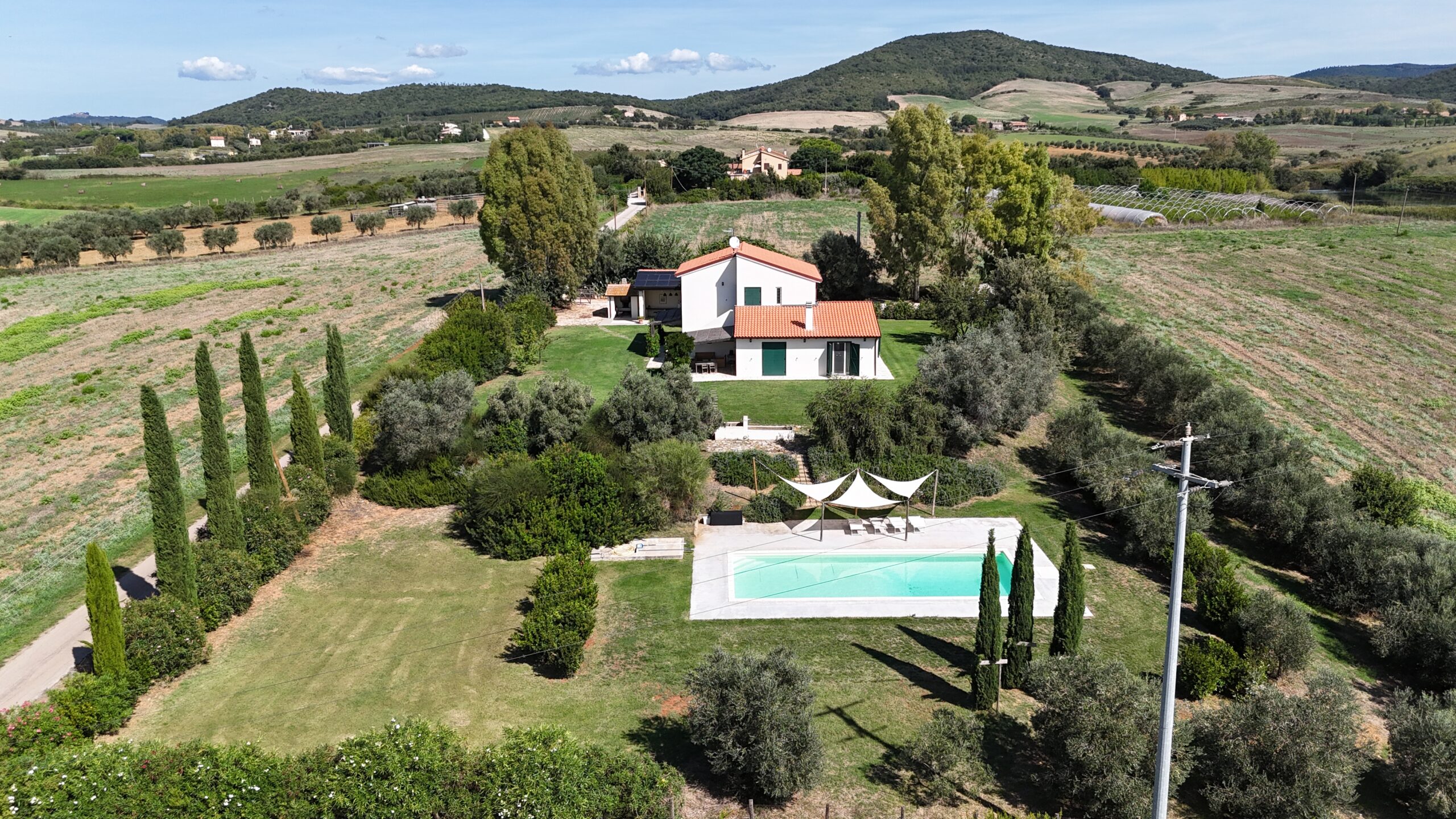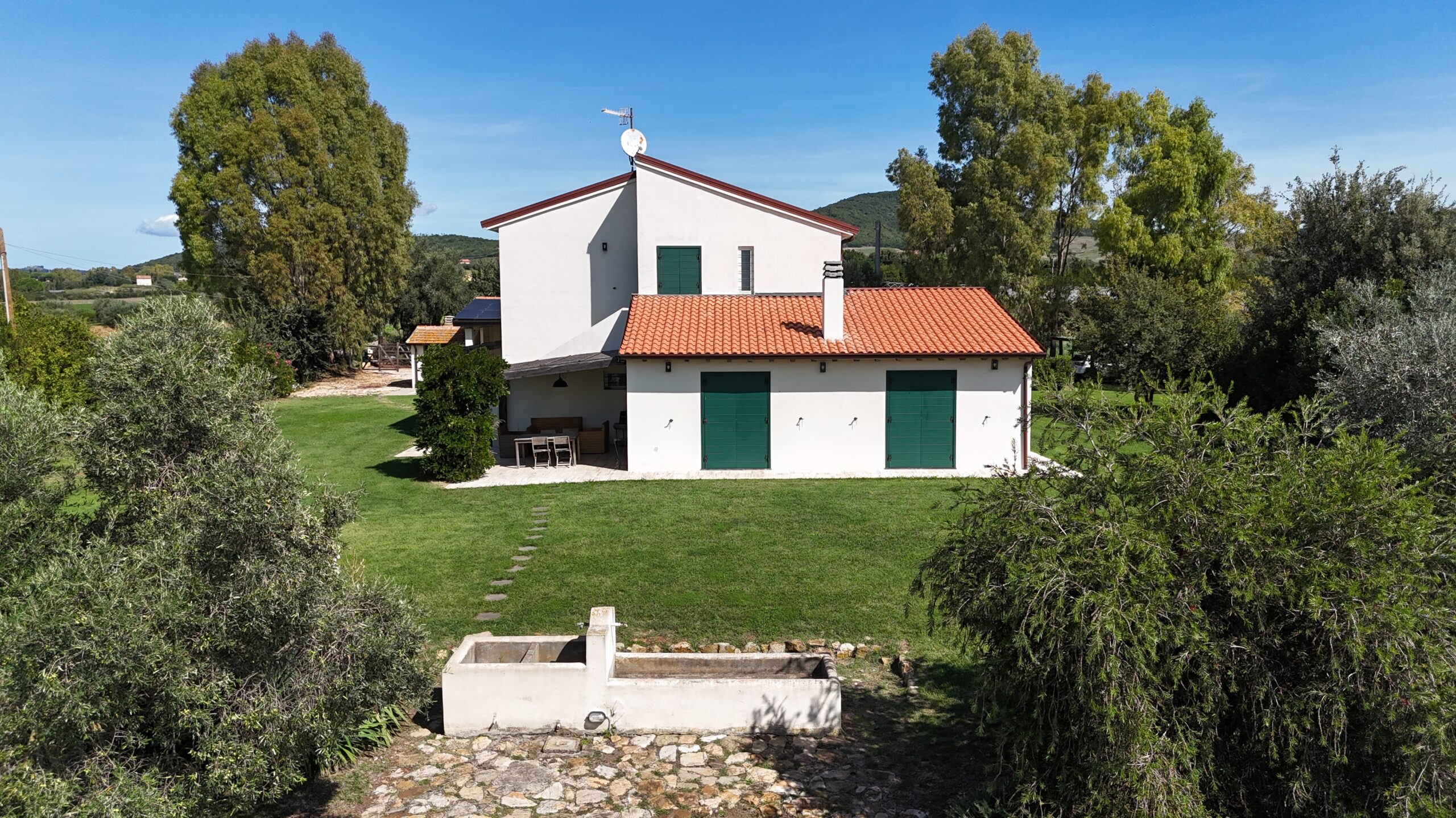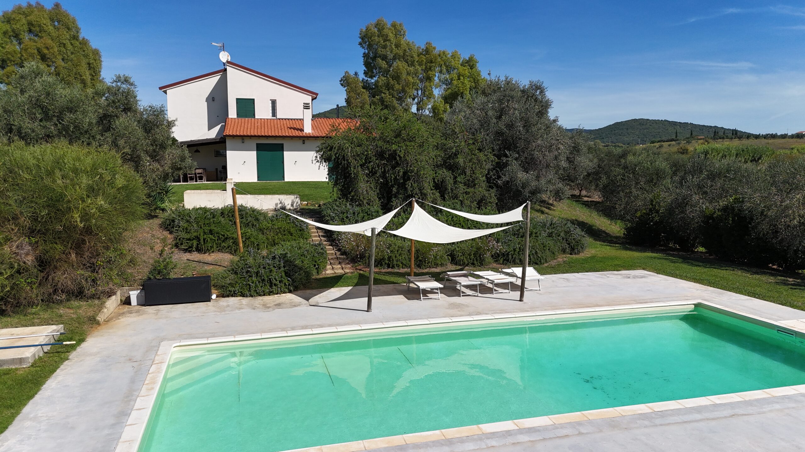 Gli spazi esterni includono un giardino alberato di circa 2 ettari, all’interno del quale si trova una splendida piscina lunga 10 metri. La villa viene fornita anche di biancheria ed è dotata di tutti i comfort necessari per un soggiorno indimenticabile.